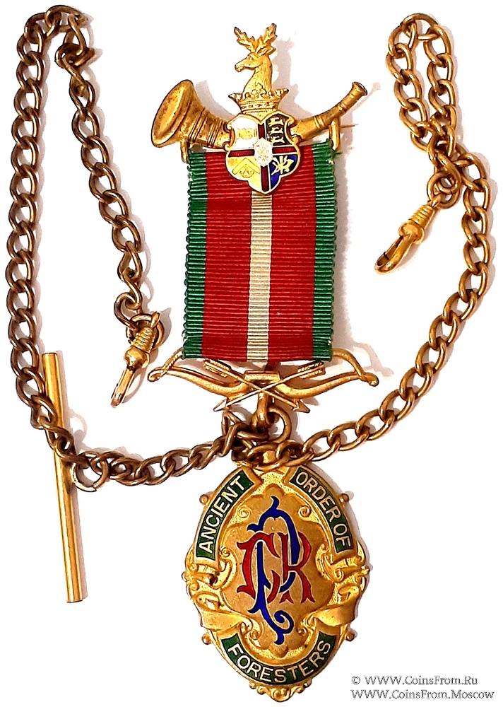 Аверс: лента зелёного цвета овальной формы с наименованием Ордена ANCIENT ORDER OF FORESTERS - Древний Орден Лесников. В центре вязь из букв P.C.R. Past Chief Ranger - Прошлый Главный Рейнджер. Знак украшен цепочкой с карабинами на концах и специальным креплением.
