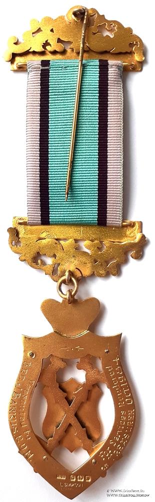 Реверс: гравировка на реверсе знака: Presented to Bro. J. Barkus R.O.H. for services rendered as Treasurer Oct. 1984 – вручён Брату J. Barkus кавалеру Ордена Свиток Чести за службу в качестве казначея. Октябрь 1984 года. Клейма: LSL, R, лев, голова леопарда. L. Simpson (London) Ltd. Выпуск: Лондон. Год выпуска: 1984.