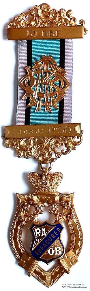 Аверс: в форме щита увенчанного короной жёлтого цвета с перекрещенными ключами, на которых наложен щит с синей эмалью и надписью TREASURER – казначей, RAOB.