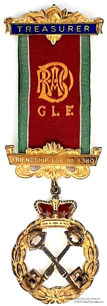 КОЛОДКИ/МЕДАЛЬОН: верхняя колодка прямоугольная, синей эмали на фоне орнамента с надписью – Treasurer – казначей. Нижняя колодка в виде ленты на фоне орнамента с наименованием и номером Ложи - Friendship LGE № 3380.