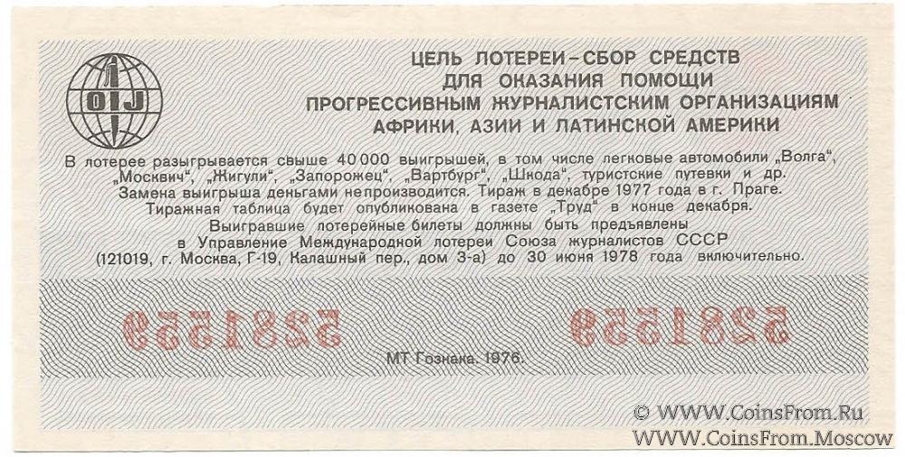 Билет. Водяной знак. Тираж в г. Праге (ЧССР). Международная лотерея солидарности журналистов.