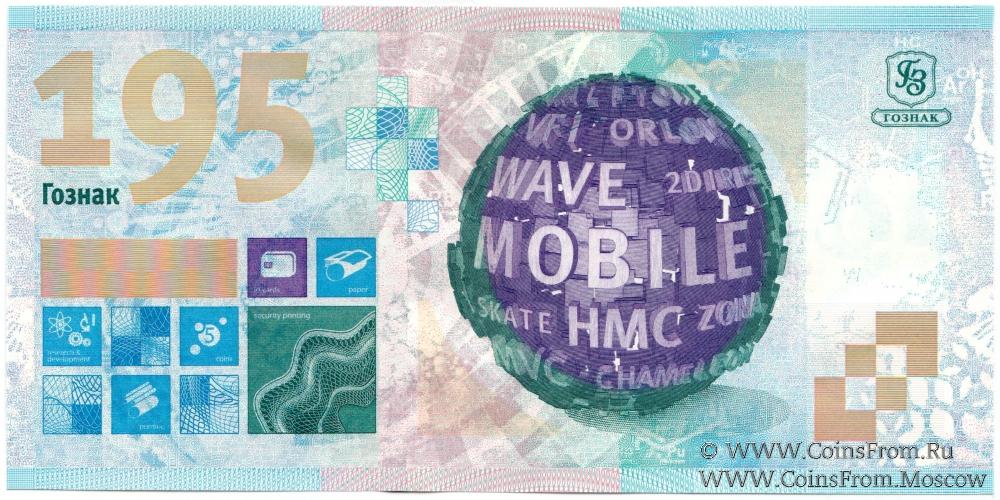Презентационная банкнота "195 лет ГОЗНАК". БРАК нумератора: разные серии ТП (в верхнем номере), ХП (в нижнем номере). Вариант 2 (полосы). Водяной знак - "195". ГОЗНАК.