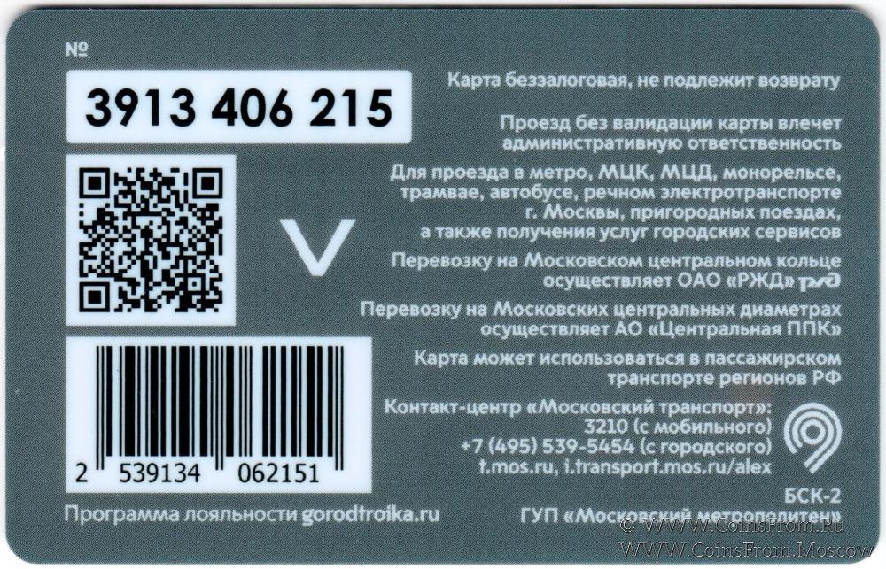 Карта сувенирная (3913) беззалоговая, не подлежит возврату. Проезд без валидации карты влечет административную ответственность. Для проезда в метро, МЦК, МЦД, монорельсе, трамвае, автобусе, речном электротранспорте г. Москвы, пригородных поездах, а также получения услуг городских