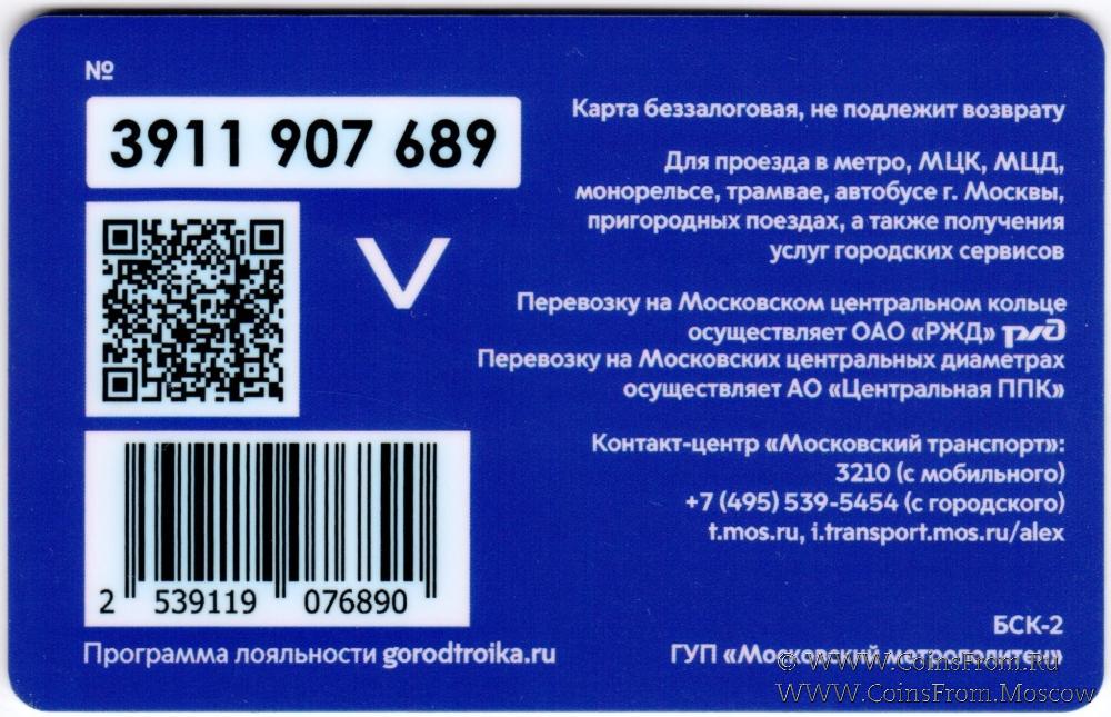 Карта сувенирная (3911) беззалоговая, не подлежит возврату. Для проезда в метро, МЦК, МЦД, монорельсе, трамвае, автобусе г. Москвы, пригородных поездах, а также получения услуг городских сервисов.