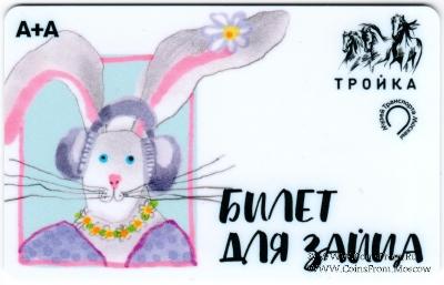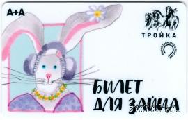 Выпуск 01.02.2024 г. карт "Тройка", посвящённых выходу детской книги "Билет для зайца". Карту можно было получить в подарок при покупке книги на сайте Музея транспорта или в сувенирных магазинах музея в павильоне "Транспорт СССР" на ВДНХ и на Северном речном вокзале (стоимость книги – 790 рублей). Серия из 3-х карт, тиражом 410 экз. каждая: