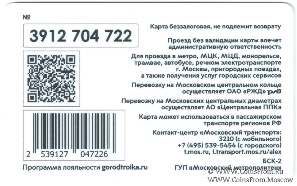 Карта беззалоговая, не подлежит возврату. Проезд без валидации карты влечет административную ответственность. Для проезда в метро, МЦК, МЦД, монорельсе, трамвае, автобусе, речном электротранспорте г. Москвы, пригородных поездах, а также получения услуг городских сервисов.
