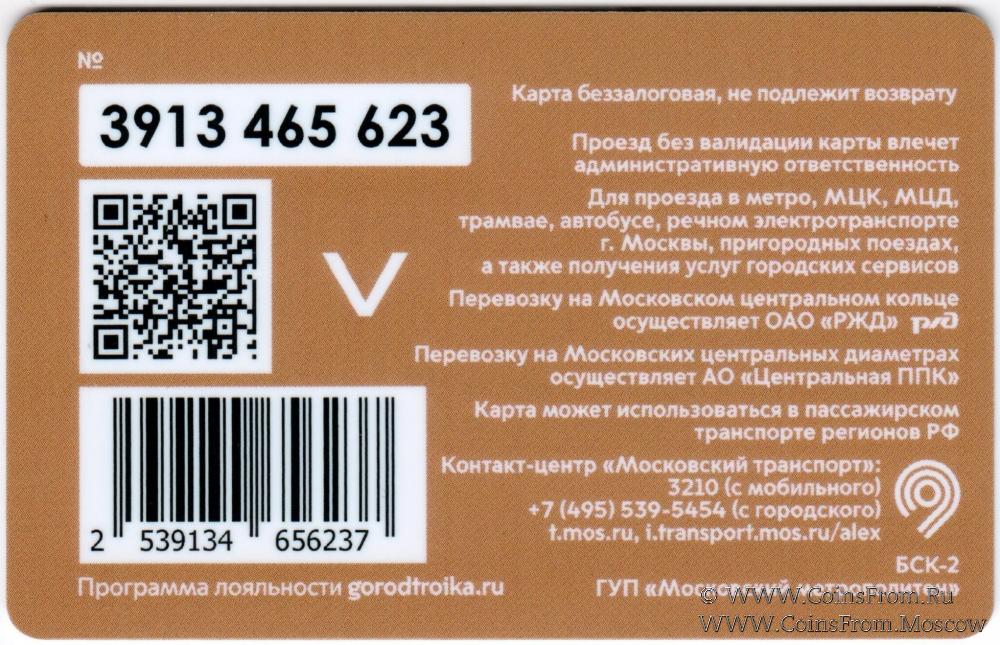 Карта сувенирная (3913) беззалоговая, не подлежит возврату. Проезд без валидации карты влечет административную ответственность. Для проезда в метро, МЦК, МЦД, трамвае, автобусе, речном электротранспорте г. Москвы, пригородных поездах, а также получения услуг городских сервисов.