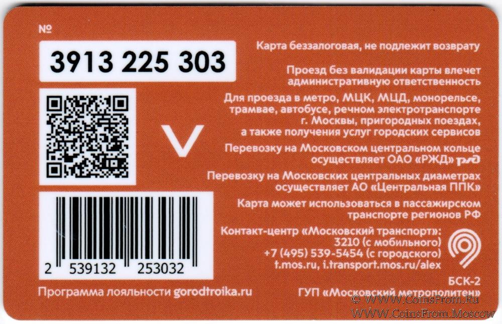 Карта беззалоговая сувенирная (№ 3913), не подлежит возврату. Для проезда в метро, МЦК, МЦД, монорельсе, трамвае, автобусе, речном автотранспорте г. Москвы, пригородных поездах, а также получения услуг городских сервисов.