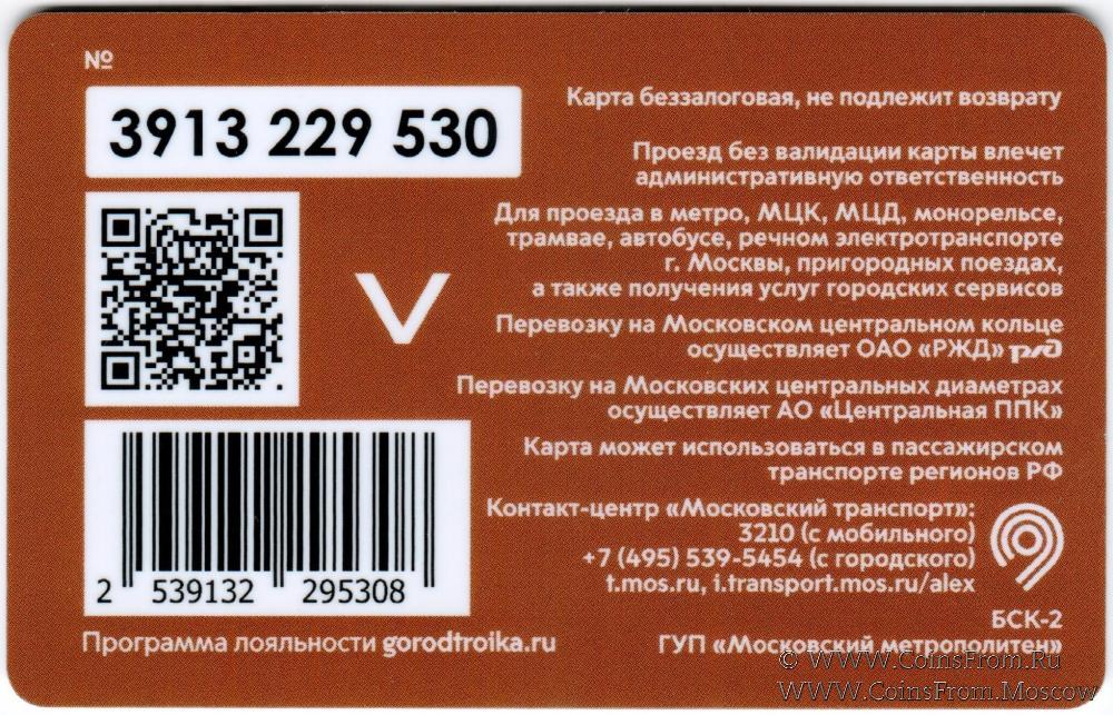 Карта беззалоговая сувенирная (№ 3913), не подлежит возврату. Для проезда в метро, МЦК, МЦД, монорельсе, трамвае, автобусе, речном автотранспорте г. Москвы, пригородных поездах, а также получения услуг городских сервисов.