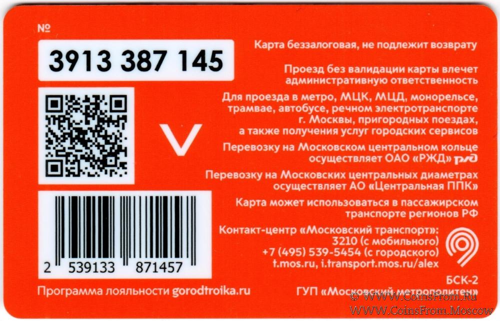 Карта сувенирная (3913) беззалоговая, не подлежит возврату. Проезд без валидации карты влечет административную ответственность. Для проезда в метро, МЦК, МЦД, монорельсе, трамвае, автобусе, речном электротранспорте г. Москвы, пригородных поездах, а также получения услуг городских сервисов.