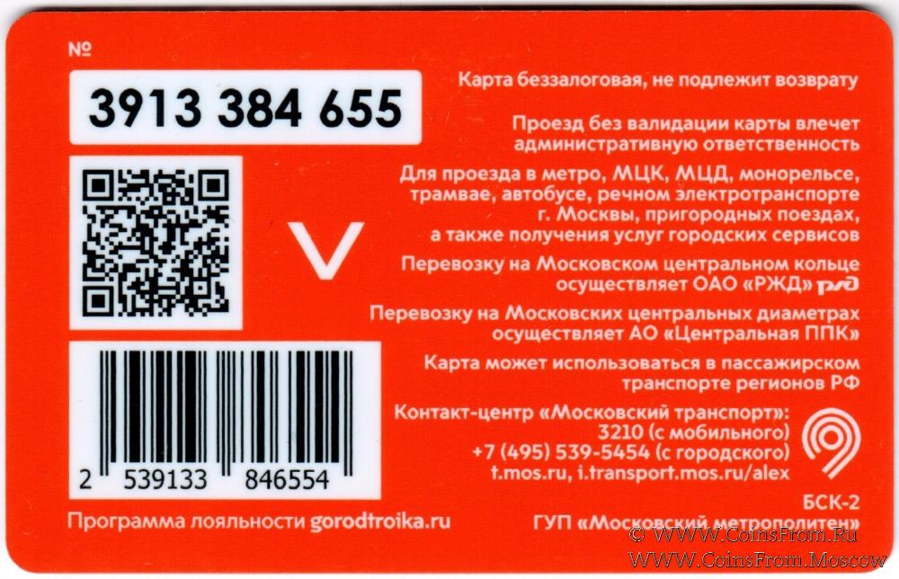 Карта сувенирная (3913) беззалоговая, не подлежит возврату. Проезд без валидации карты влечет административную ответственность. Для проезда в метро, МЦК, МЦД, монорельсе, трамвае, автобусе, речном электротранспорте г. Москвы, пригородных поездах, а также получения услуг городских сервисов.