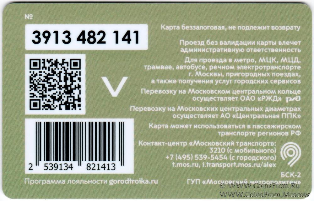 Карта сувенирная (3913) беззалоговая, не подлежит возврату. Проезд без валидации карты влечет административную ответственность. Для проезда в метро, МЦК, МЦД, трамвае, автобусе, речном электротранспорте г. Москвы, пригородных поездах, а также получения услуг городских сервисов.