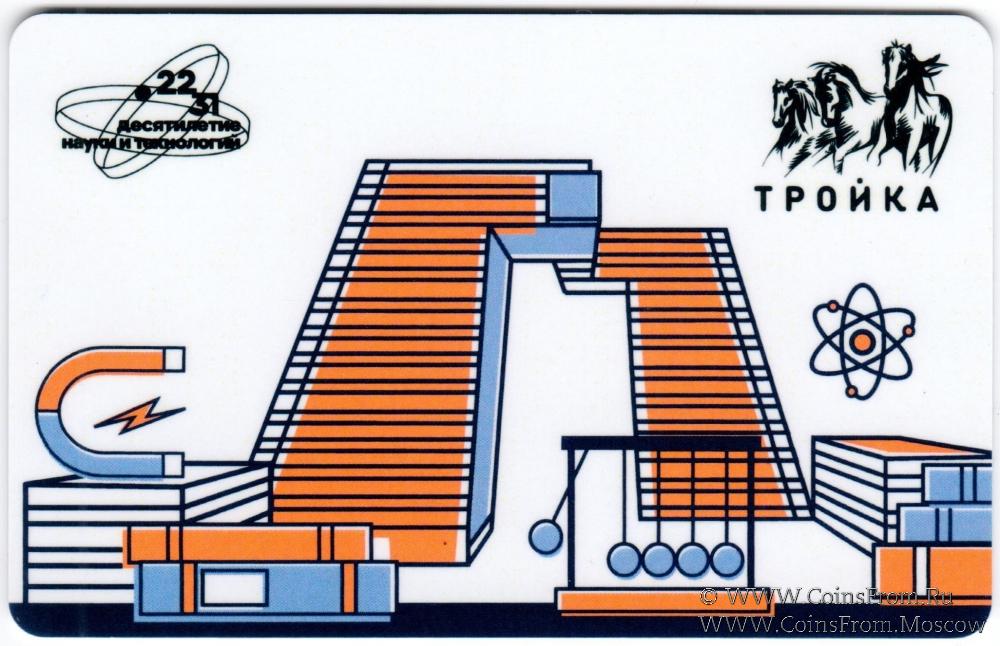 Электронная транспортная карта "Тройка". Размер: 85,5 * 54 мм. Серия из двух карт "Тройка", посвящённых 10-летию науки и технологий в России и Национальным проектам России. Тематическая карта "Тройка" подчёркивает важность науки и её вклад в развитие транспорта и повышение качества жизни в городе. Вариант 2.