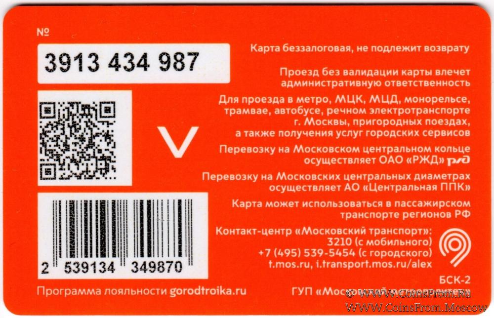 Карта сувенирная (3913) беззалоговая, не подлежит возврату. Проезд без валидации карты влечет административную ответственность. Для проезда в метро, МЦК, МЦД, монорельсе, трамвае, автобусе, речном электротранспорте г. Москвы, пригородных поездах, а также получения услуг городских сервисов.
