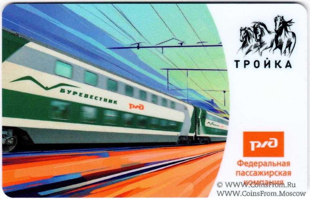 Электронная транспортная карта "Тройка". Размер: 85,5 * 54 мм. Серия из трёх карт "Тройка" с изображением двухэтажного скоростного фирменного поезда "Буревестник" Федеральной пассажирской компании (ФПК – дочерняя компания ОАО "РЖД"), который с 3 декабря 2025 года начал курсировать между Москвой и Нижним Новгородом. Вариант 1 ("В пути").