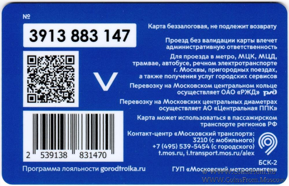 Карта сувенирная (3913) беззалоговая, не подлежит возврату. Проезд без валидации карты влечет административную ответственность. Для проезда в метро, МЦК, МЦД, трамвае, автобусе, речном электротранспорте г. Москвы, пригородных поездах, а также получения услуг городских сервисов.