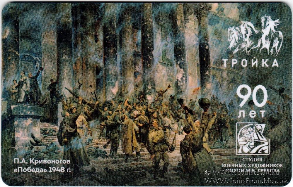 Электронная транспортная карта "Тройка". Размер: 85,5 * 54 мм. Тематическая карта "Тройка" посвящена 90-летию Студии военных художников имени М. Б. Грекова. Выпуск 1 (серия из 7 карт): Кривоногов П.А. "Победа" 1948 г. Одна из работ на тему Великой Отечественной войны, которая вошла в сокровищницу национального искусства и стала классикой советской реалистической школы.