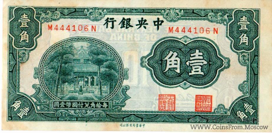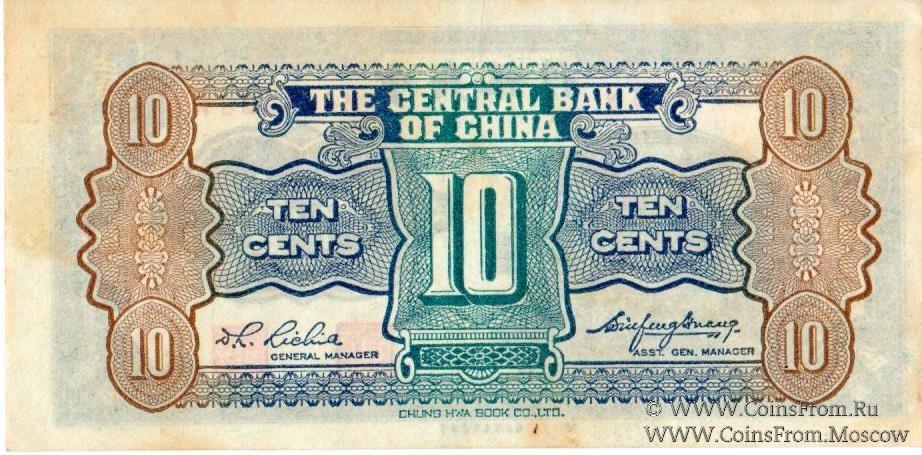 Выпуск 1931 г. 10 центов=1 чао. Центральный Банк Китая (The Central Bank of China, 行銀央中). CHUNG HWA BOOK CO., LTD