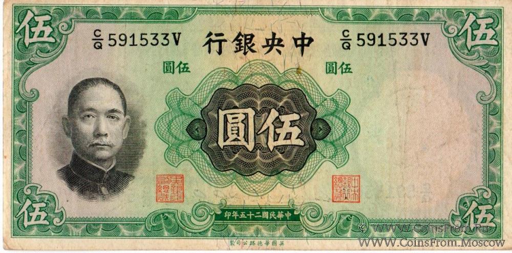 Выпуск 1936 г. Центральный Банк Китая (The Central Bank of China, 行銀央中). Типография: W&S (WATERLOW & SONS LIMITED, LONDON)