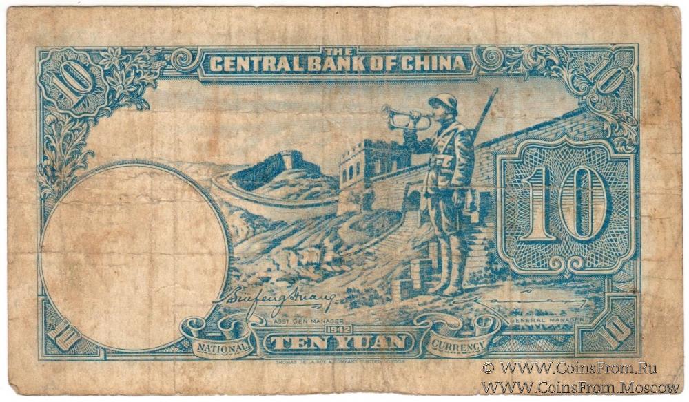 Выпуск 1942 г. Вариант подписи Управляющего (1). Центральный Банк Китая (The Central Bank of China, 行銀央中). TDLR (THOMAS DE LA RUE & COMPANY LIMITED LONDON).