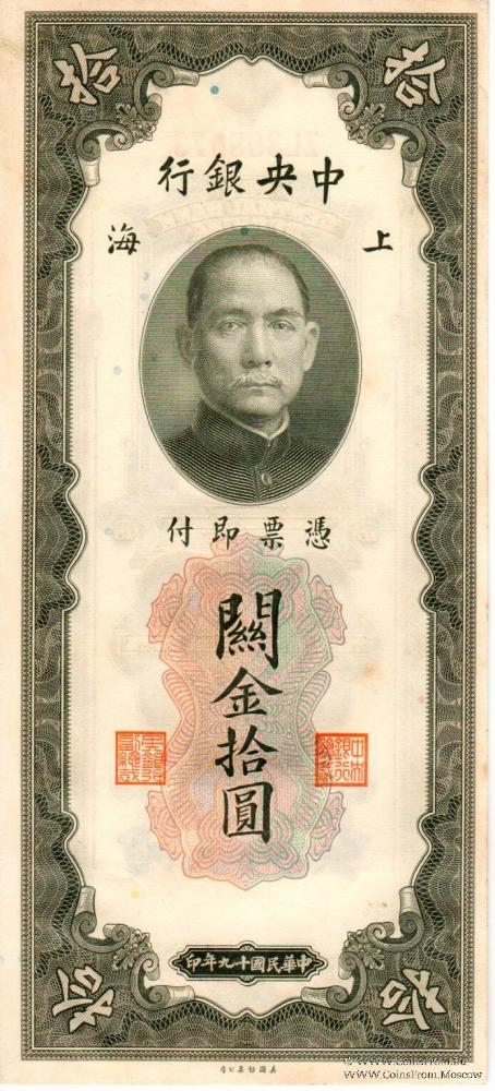 Главная > Магазин > Банкноты > Иностранные государства > Азия > Китай > Китайская республика (中華民國) > Центральный Банк Китая. Выпуск в таможенных золотых единицах. > 10 CGU 1930 г.
