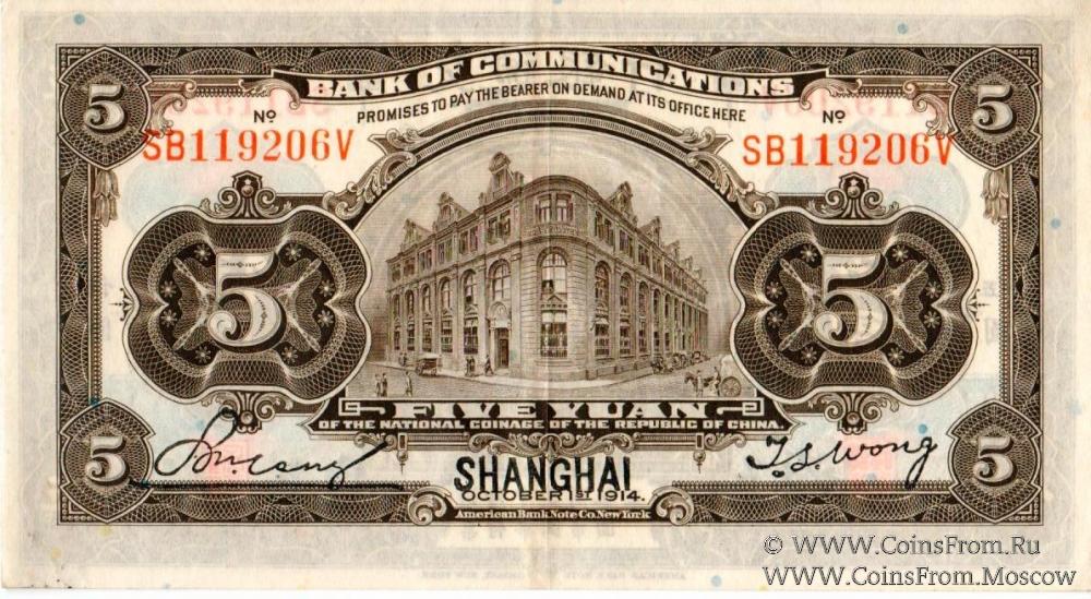 Выпуск 1914 г. Серия из 3-х литер (ХХ № Х). Подписи на реверсе черные. Банк Путей Сообщения (Bank of Communications / 行銀通交). Шанхай (Shanghai).
