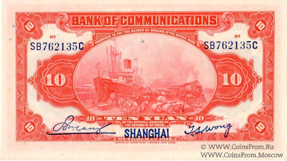 Выпуск 1914 г. Серия из 3-х литер (ХХ № Х). Подписи и надпечатки синие. Банк Путей Сообщения (Bank of Communications / 行銀通交). Шанхай (Shanghai).