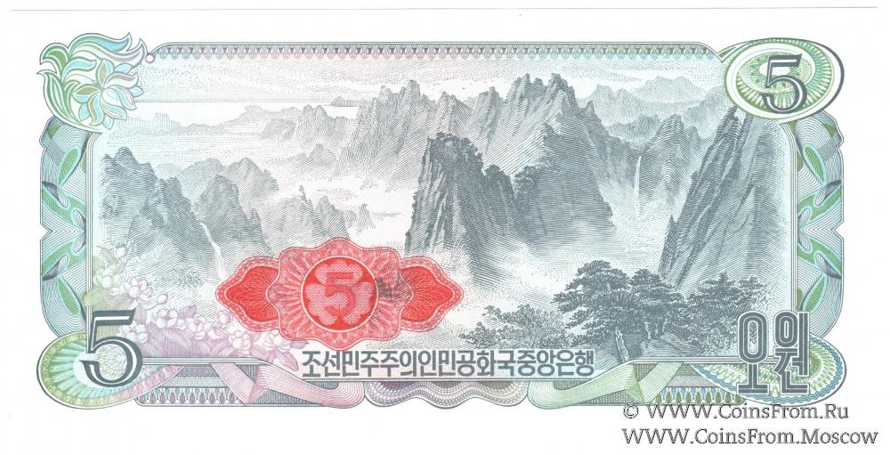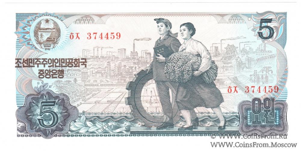 Выпуск 1978 г. Номер красный и красный, красная печать "5". Центральный банк Корейской Народно-Демократической Республики (조선민주주의인민공화국중앙은행).