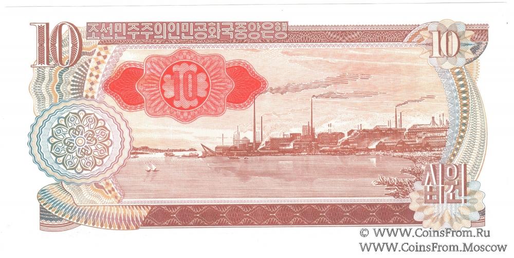 Выпуск 1978 г. Номер красный и красный, красная печать "10". Центральный банк Корейской Народно-Демократической Республики (조선민주주의인민공화국중앙은행).