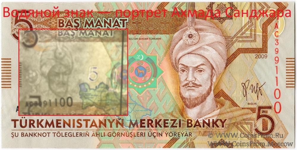 - 5 манатов — портрет Ахмада Санджара (последний султан Сельджукской империи с 1118 по 1153 год из династии Сельджукидов);