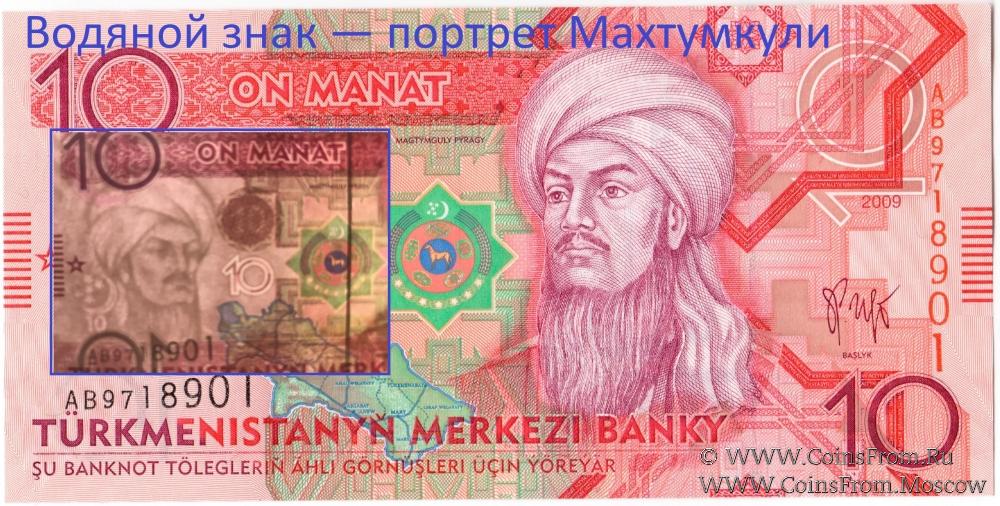 - 10 манатов — портрет Махтумкули (1724-1807) (туркменский поэт, философ, классик туркменской литературы);