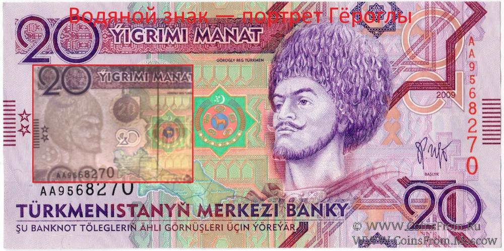 - 20 манатов — портрет Гёроглы (фольклорно-эпический памятник тюркских (огузских) народов, сложившийся к XVII веку);