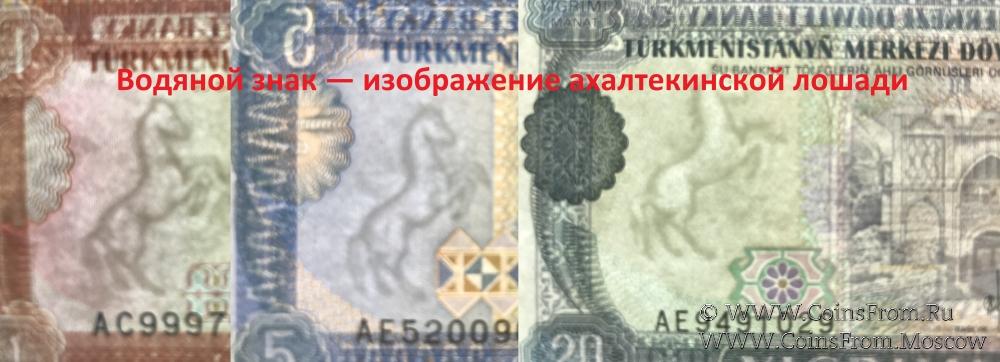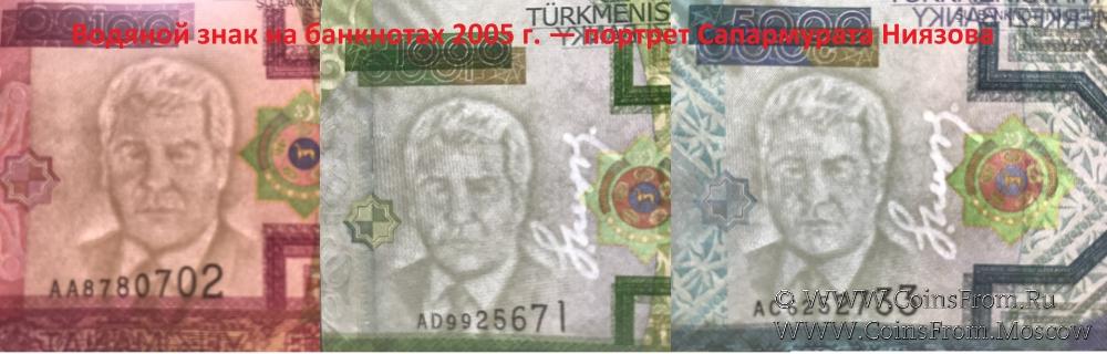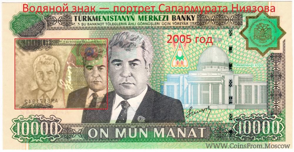 1993—2005 гг. — изображение ахалтекинской лошади; на банкноте 10.000 манатов 2005 года — портрет Сапармурата Ниязова.