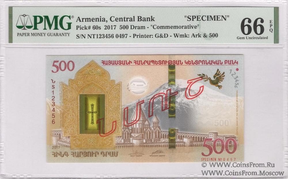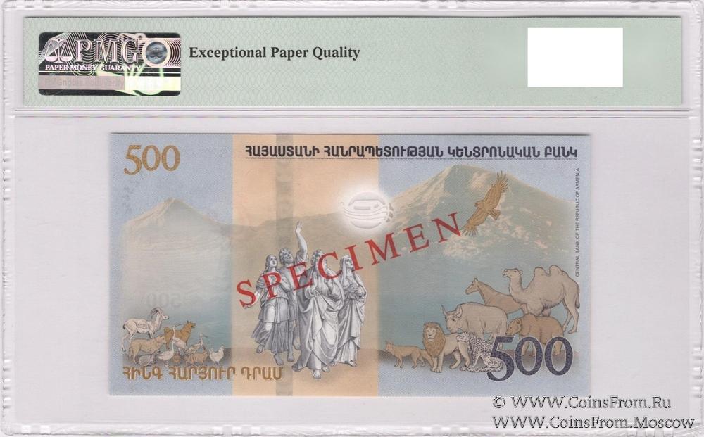 ОБРАЗЕЦ № 0497. Надпись по диагонали красного цвета ОБРАЗЕЦ: на аверсе объемными буквами на армянском (ՆՄՈՒՇ), на реверсе - на английском языке (SPECIMEN).