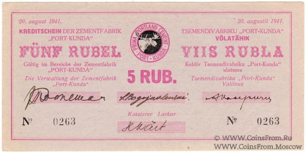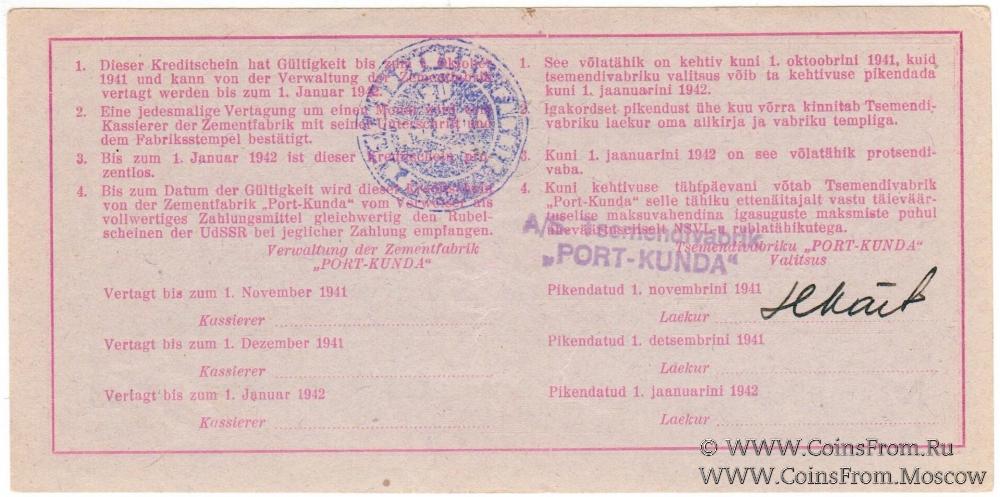 Кредитный сертификат цементного завода "Порт-Кунда" 1941 г. (Kreditschein der Zementfabrik "Port-Kunda, 1941). Текст фиолетовый на немецком и эстонском языках. Продлен до 01.11.1941 г. Штамп "A/S Tsemendivabrik PORT-KUNDA". Бумага сиреневая.