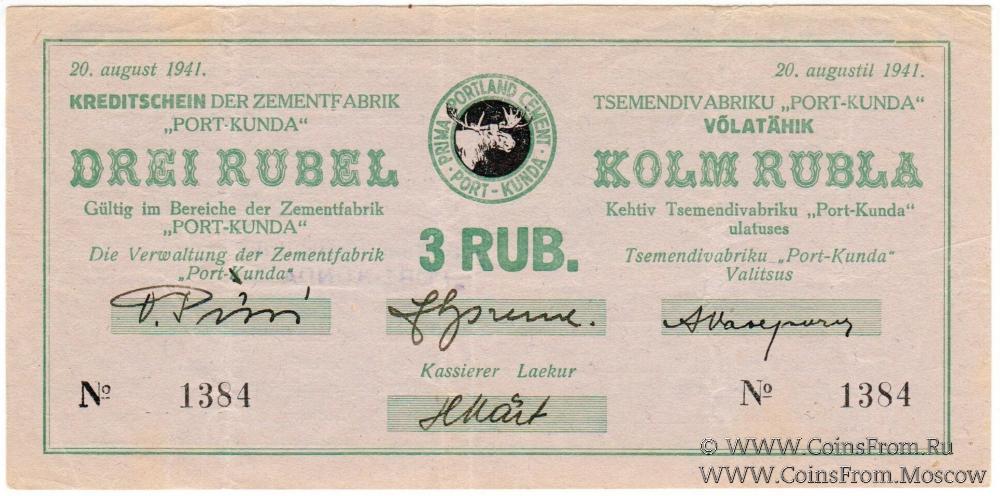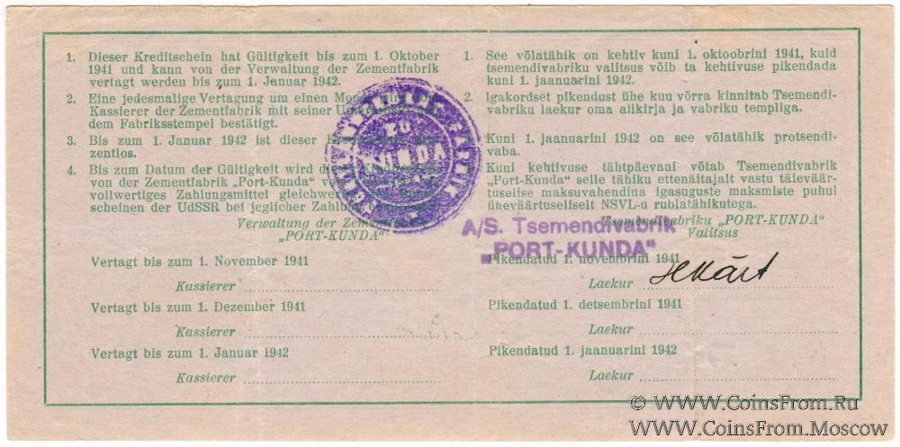 Кредитный сертификат цементного завода "Порт-Кунда" 1941 г. (Kreditschein der Zementfabrik "Port-Kunda, 1941). Текст зеленый на немецком и эстонском языках. Продлен до 01.11.1941 г. Штамп "A/S Tsemendivabrik PORT-KUNDA". Бумага сиреневая.