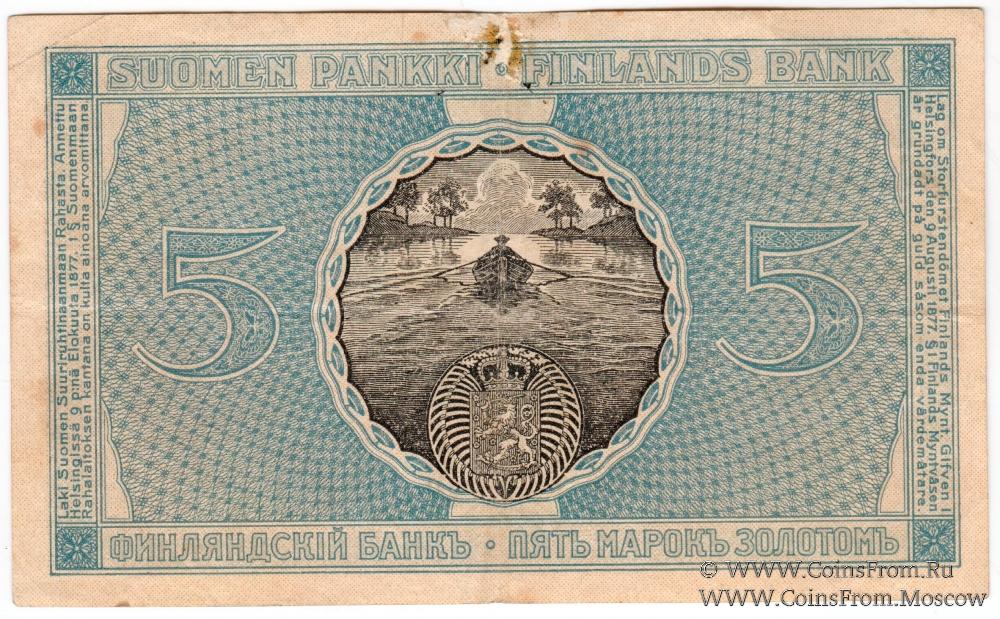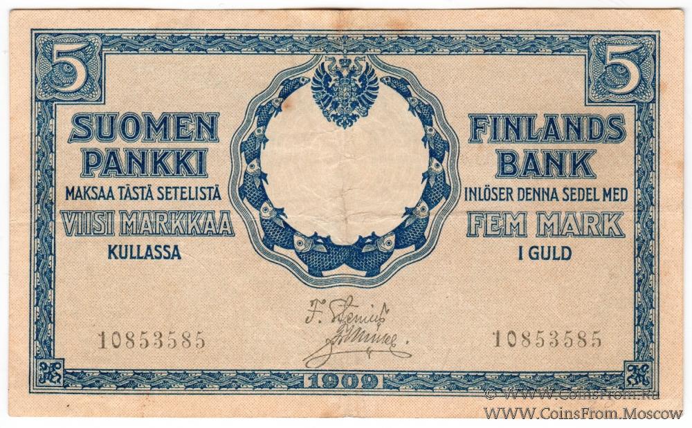 Выпуск 1909 г., в золотых марках. Вариант по подписям. Номер 8-значный. Без водяного знака. Банк Финляндии (Suomen Pankki, Finlands Bank).
