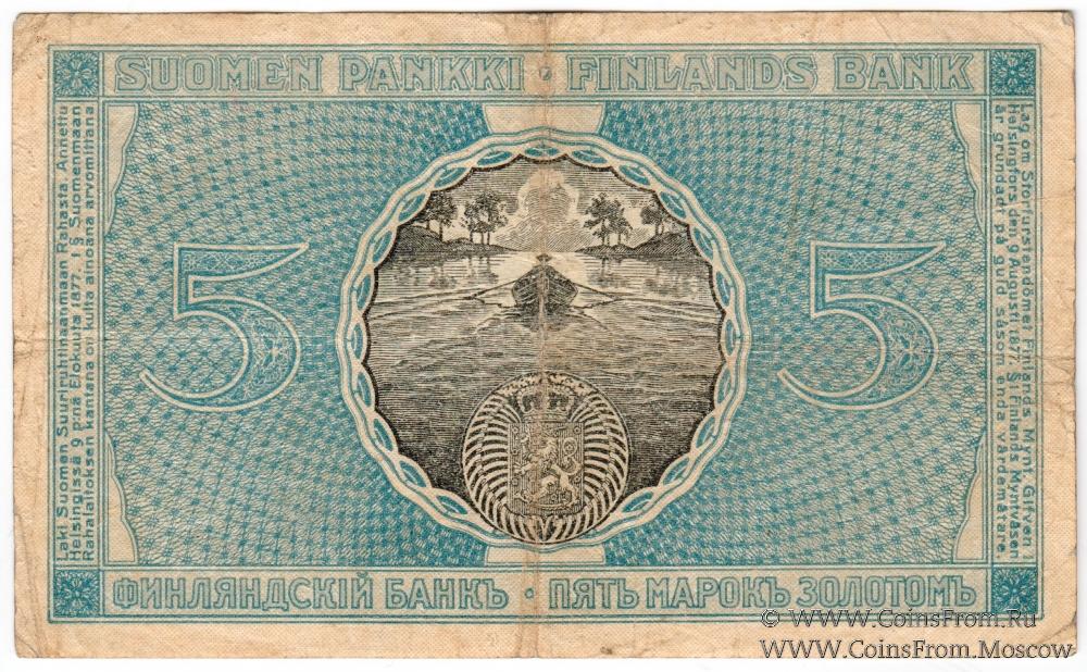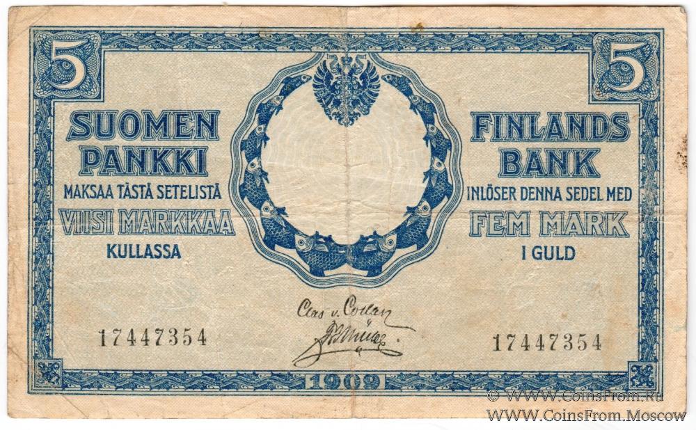 Выпуск 1909 г., в золотых марках. Вариант по подписям. Номер 8-значный. Водяной знак - "SP FB". Банк Финляндии (Suomen Pankki, Finlands Bank).