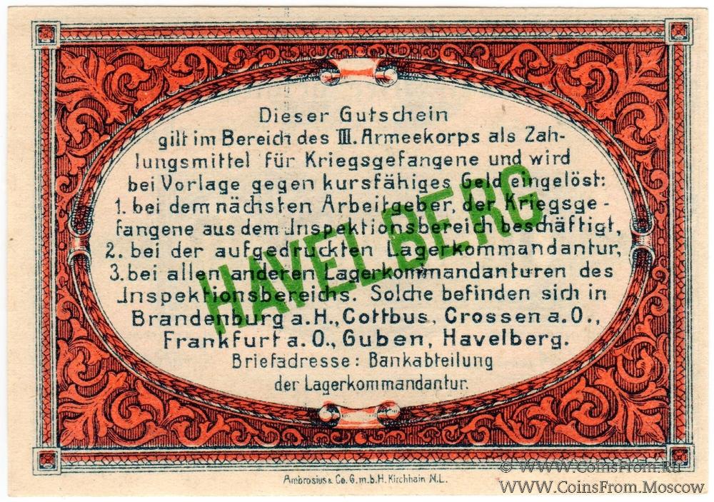 Купон. 1 октября 1917 года. (Gutschein. 1 Oktober 1917). Солдатский лагерь военнопленных Havelberg.