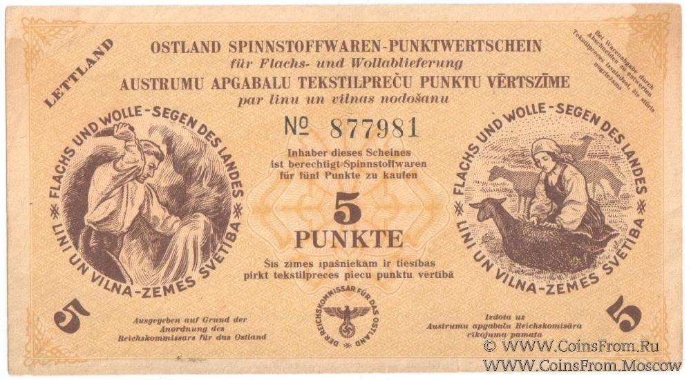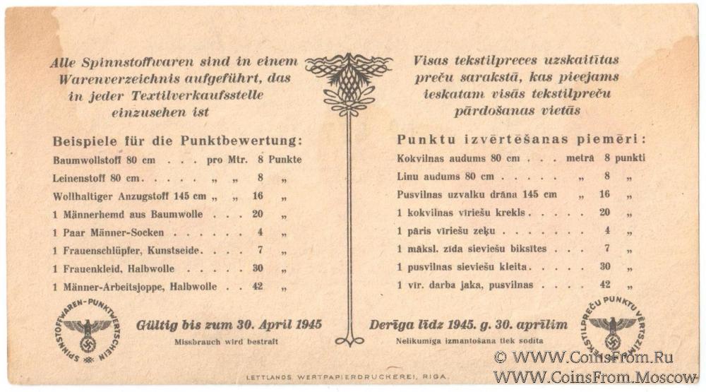 Текстильные талоны. Reichskommissariat OSTLAND. Номер 6-значный. LWR (LETTLANDS WERTPAPIERDRUCKEREI, RIGA).