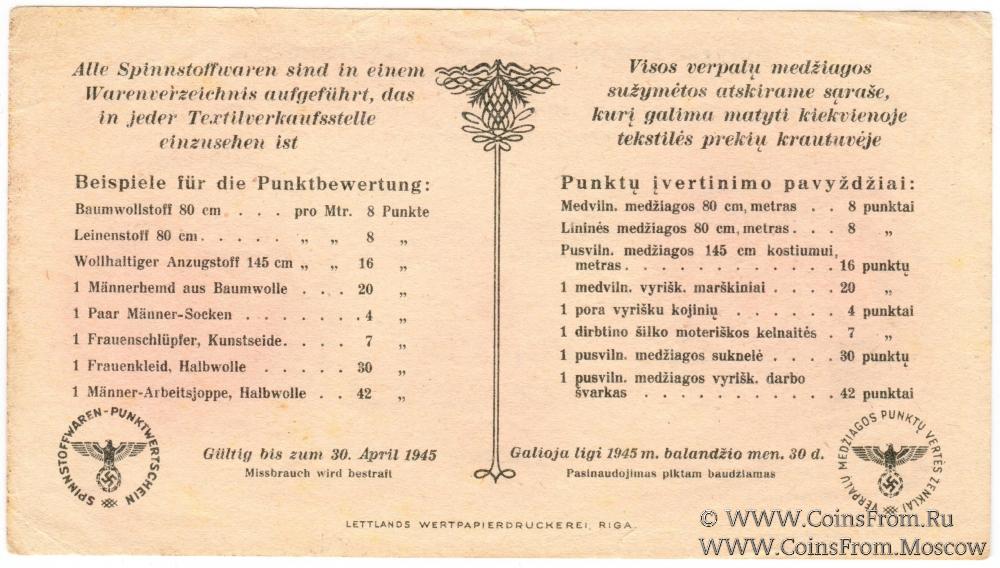 Текстильные талоны. Reichskommissariat OSTLAND. Без номера. LWR (Lettlands Wertpapierdruckerei, Riga).