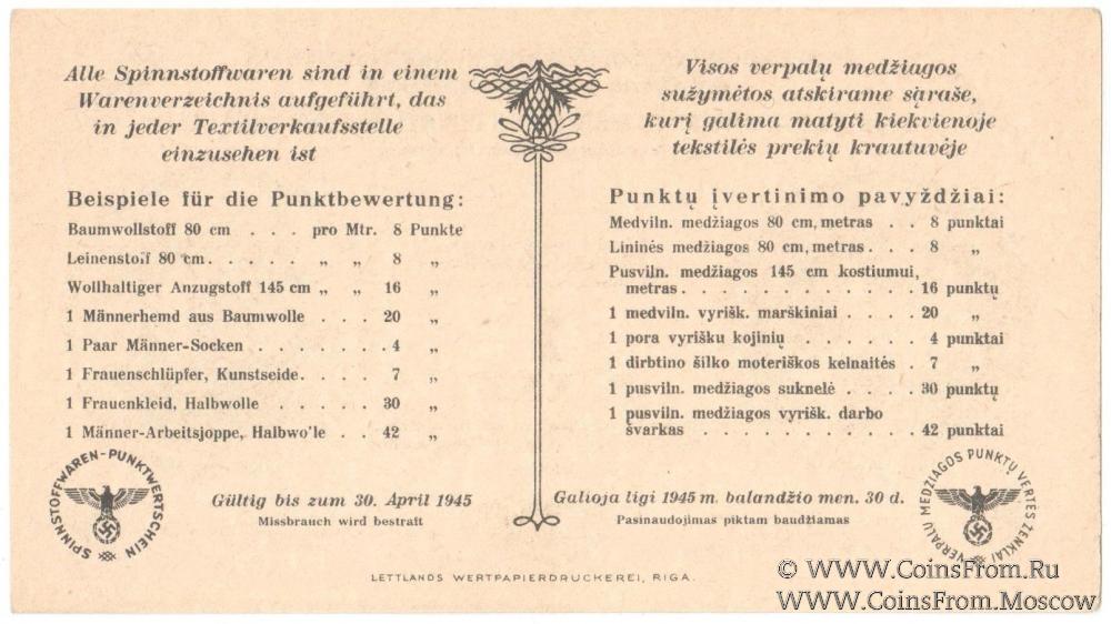 Без номера. LWR (LETTLANDS WERTPAPIERDRUCKEREI, RIGA). Текстильные талоны. Reichskommissariat OSTLAND.