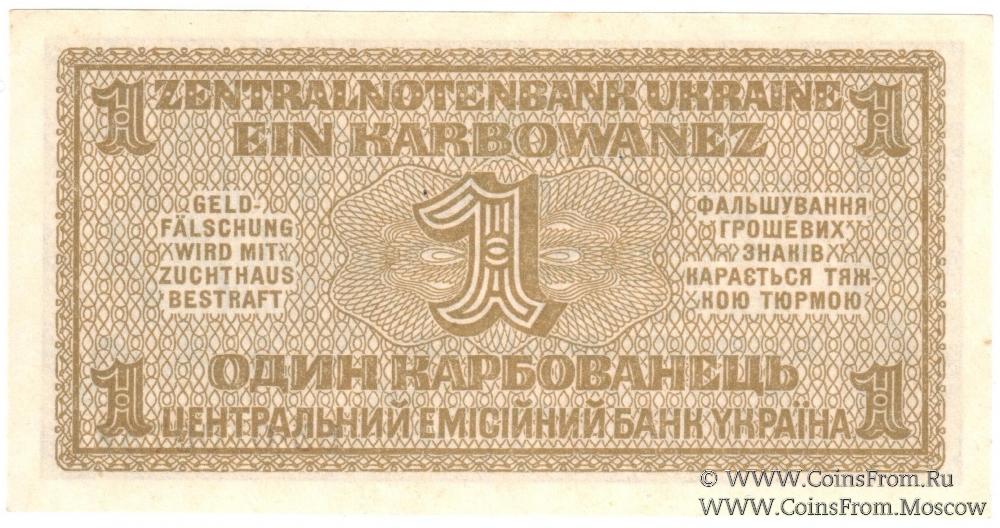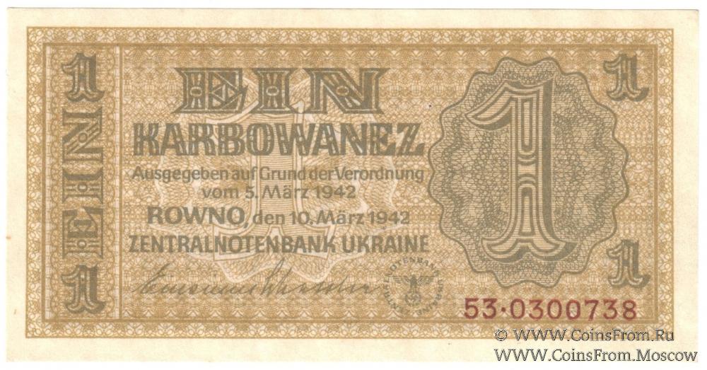 Карбованец рейхскомиссариата Украина. Обращались на оккупированной территории западной и центральной Украины параллельно с немецкими марками (10 карбованцев = 1 рейхсмарка). Размер ~93х48 мм. Номер 7-значный. Водяной знак.