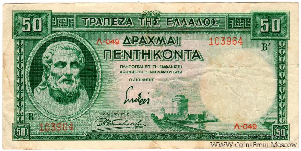 Выпуск 1939 г. Банк Греции (ΤΡΑΠΕΖΑ ΤΗΣ ΕΛΛΑΔΟΣ).