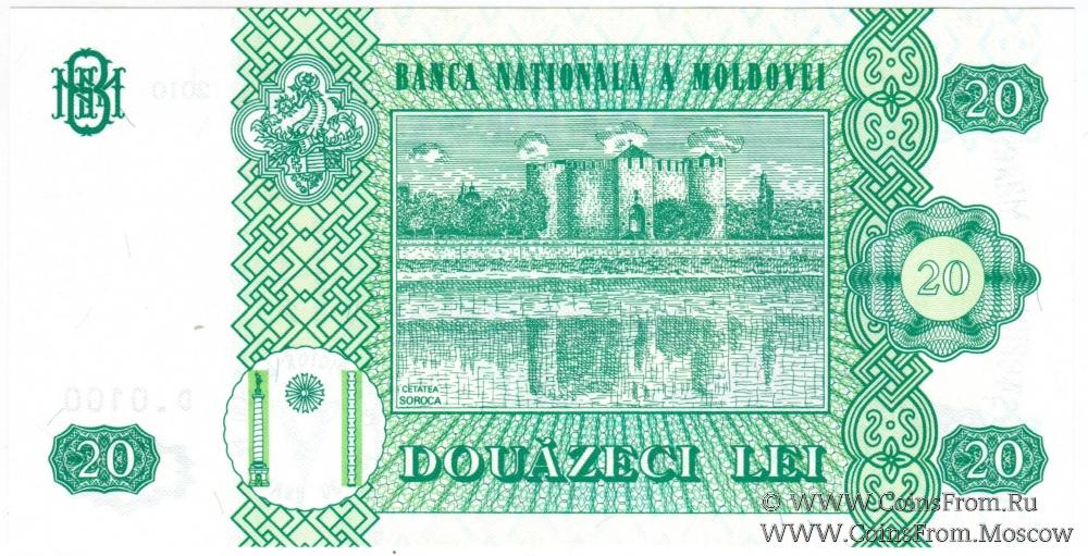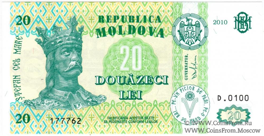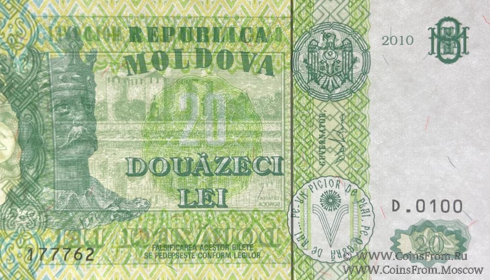 Выпуск 2010 г. в леях. БРАК: без водяного знака, магнитная полоса справа. Серия D. Эмиссии Национального банка Молдовы (Banca Naţională a Moldovei).