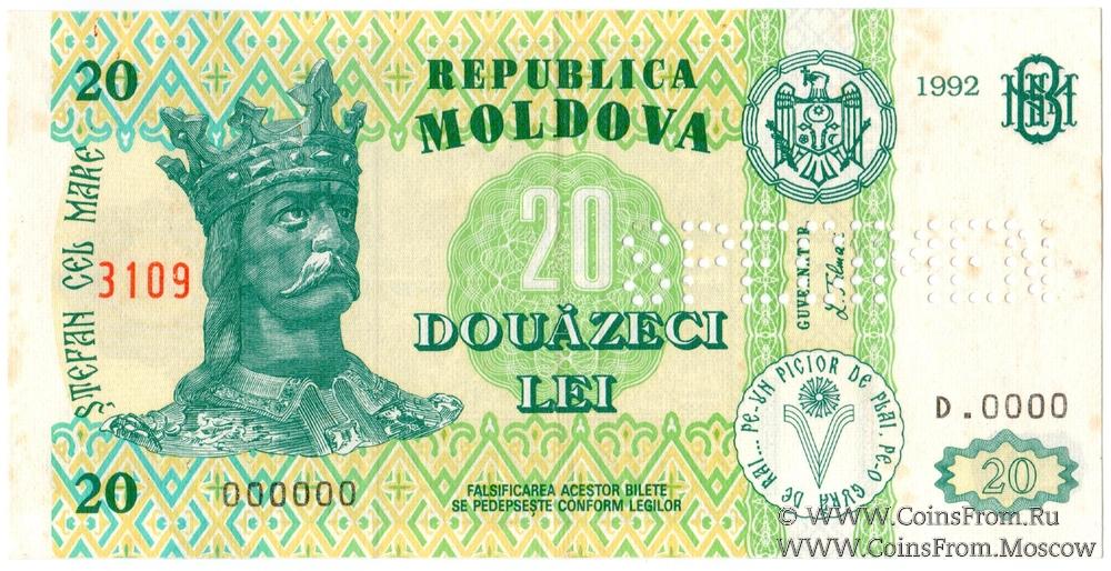 Выпуск 1992 г. в леях. ОБРАЗЕЦ № 3109: горизонтальная перфорация "SPECIMEN". Серия D. (Выпуск 1992 г.). Эмиссии Национального банка Молдовы (Banca Naţională a Moldovei).