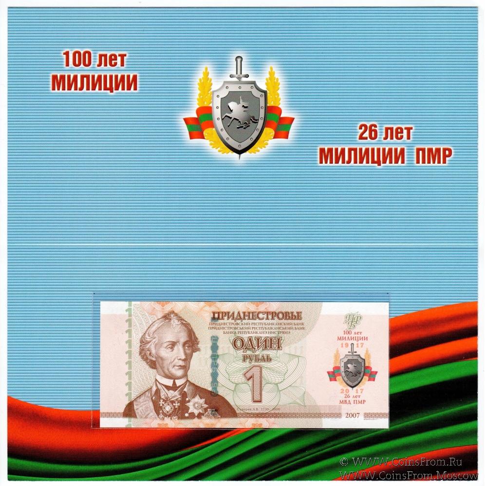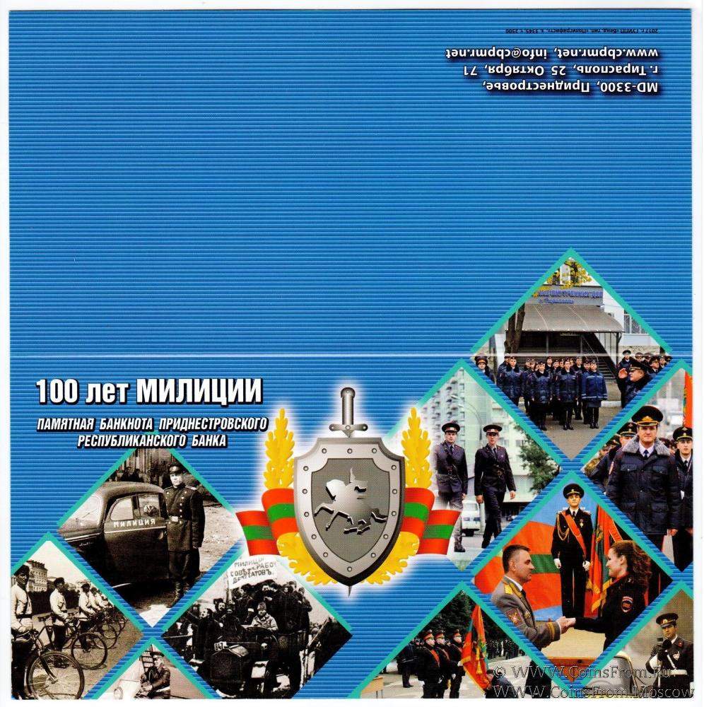 Памятная банкнота имеет формат и дизайн, аналогичный банкноте модификации 2012 года соответствующего номинала, с нанесением в правом поле лицевой стороны банкноты специальной маркировки с изображением эмблемы Министерства внутренних дел ПМР, вверху надписи – "100 лет МИЛИЦИИ", "1917", внизу надписи – "2017", "26 лет МВД ПМР".