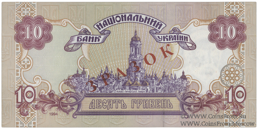 Надпечатка типографским шрифтом красного цвета "ЗРАЗОК" на аверсе и реверсе по диагонали. Национальный Банк Украины (Національний банк України).