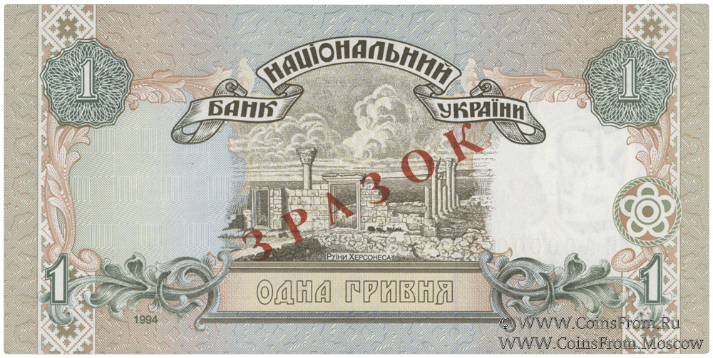 Надпечатка типографским шрифтом красного цвета "ЗРАЗОК" на аверсе и реверсе по диагонали. Национальный Банк Украины (Національний банк України).