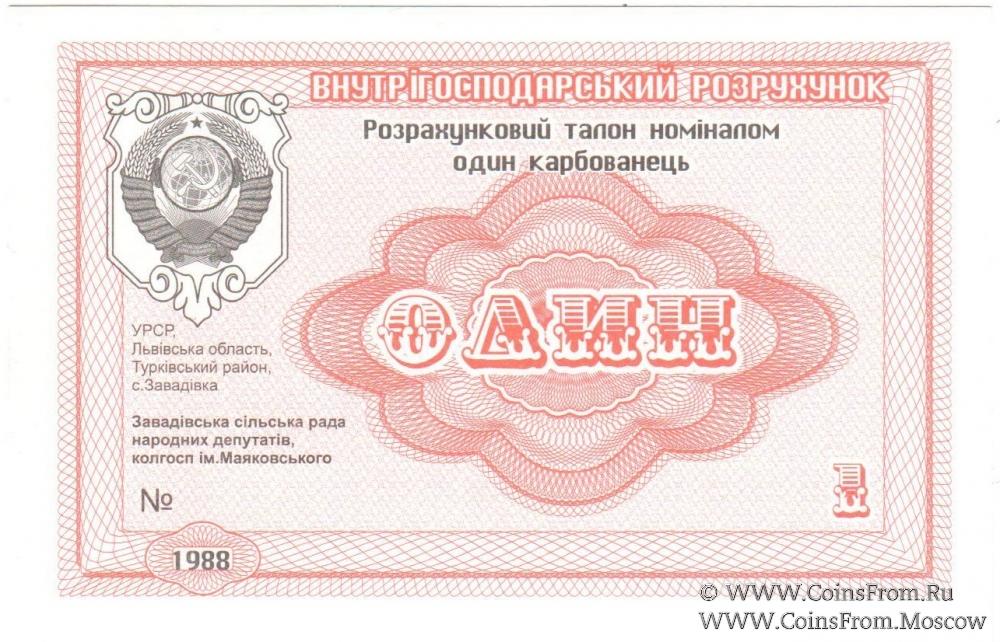 Расчетный талон 1988 г. Бланк без номера. Колхоз "Им. Маяковского".